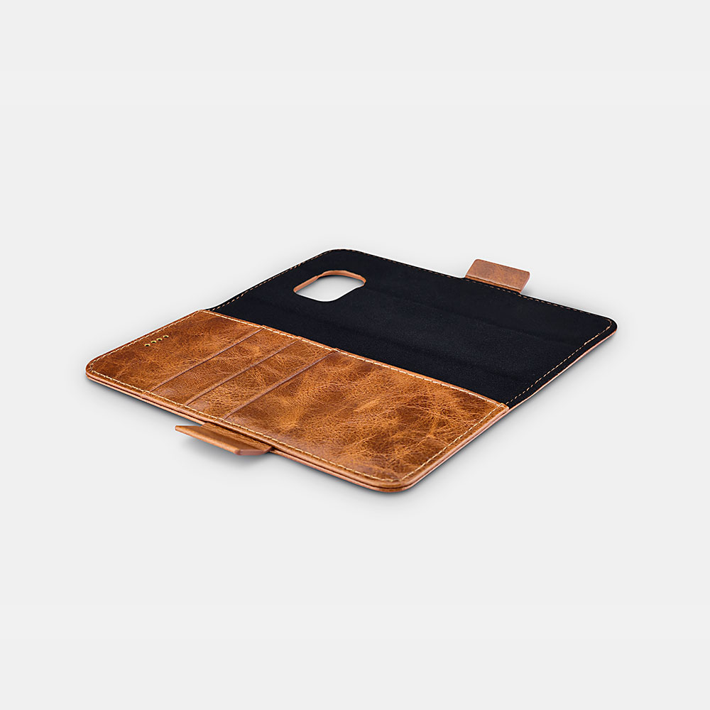 1.由100%真皮牛皮制成,纯手工制作,设计新颖; 2.头层天然原皮,每一张的牛皮的纹路都不一样,毛孔褶皱清晰可见; 3. 二合一设计结合钱包款与可拆卸单底手机壳; 4. 三个卡槽和一个收纳夹,可放少量现金和各种卡类,是出行的好帮手; 5. 独特的侧边开口设计,无需拆卸外壳即可轻松控制手机开关。