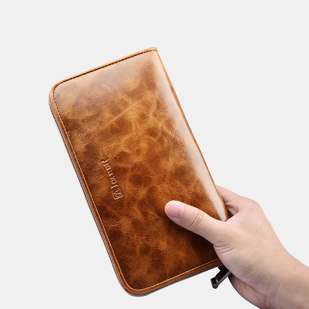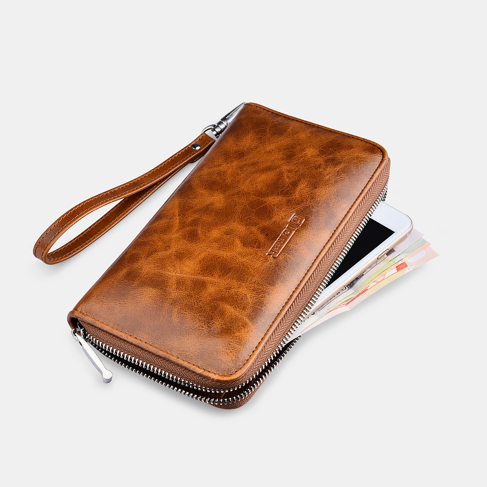 1.用棕色油蜡皮做出复古感觉,大面整洁大气; 2.收包能容纳非常多的卡和钱,还能把手机,钥匙放进去; 3.采用高品质拉链,开合非常顺畅舒适。